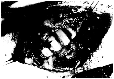 図5-2。モノフィラメント縫合糸を、予定された気管切開部のすぐ前端と尾端にある気管軟骨を通して設置した。縫合糸は結節を作り長く糸を残しておく。これらの縫合糸は、必要ならば気管切開チューブの交換を容易にするように気管切開孔を切り広げられるようにしている。