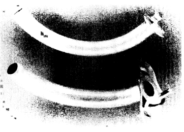 図5-4。旧式の金属気管切開チューブ。内側のカニューレを抜き出した。内側カニューレを間欠的に抜去することにより、粘液をチューブの端からふき取ることが可能となり、チューブ閉塞症が予防できる。