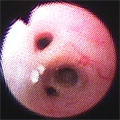 | 初診時胸部X線写真。肺野および心陰影に異常を認めず。 | 気管支鏡所見。LB2D1より白色円柱状物が飛び出してきたようにみえた。 | 同。RB4内にも同様の白色円柱状物がみえた。 | 白色物の細胞診標本。線毛上皮細胞、好酸球、杯細胞を含む粘液であった。 |