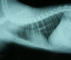 | 経過:初診時、体温:39.1℃ 心拍数:200/分 呼吸数:68/分。可視粘膜色良好。食欲元気なし。咳なし。聴診にて心音遠く感じられた。心雑音なし。肺音粗励。胸部X線にて心陰影拡大、気管分岐部挙上、肺野スリガラス陰影が認められた。動脈血ガス分析にてpH7.416, Pco2 27.3 mmHg, Po2 96.4mmHgと肺機能は保たれていた。心嚢液貯留と心機能低下による間質性肺水腫を疑い、利尿剤投与を始めた。翌日、スリガラス影は消失した。第8病日、さらに心陰影が拡大していたので、全身麻酔下、気管内挿管下にて心嚢液の試験穿刺を行った。麻酔前のCBC生化学検査ではWBC 11000/μLで左方移動認めず、ALB2.2g/dlと低下していた。伏臥位にて、透視下に22G静脈留置針を用い右第6肋間を穿刺した。計154mlの血膿様液(Ht9%, WBC>99900/μL, TP5.0g/dl)が抜去された。上清は黄色透明で比重1.033、TP5.0と滲出性、沈渣細胞診にて多数の変性好中球がみられた。培養にてPasteurella属の細菌が検出され、ABPC, AMPC, CEZ, EM, GM,AMK, MINO, OFLX, ENX, FOMに感受性を示した。由来は不明だが、化膿性心嚢液が貯留していたことが判明した。入院管理となりABPC20mg/kgとGM5mg/kgの投与を開始した。第12病日再び19mlの血膿様液を抜去したが培養にて菌は検出されなかった。それ以降心嚢液の再貯留を認めなかった。第22病日経過良好のめ退院。自宅ではバイトリル錠25mgを毎日投与してもらった。その後1ヶ月ごとに3ヶ月間継続して胸部X線心陰影を経過観察したが、再発を認めなかった。 | |||