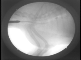 処置:自作シリコンステント(図5)、Wallstentに交換、さらに前方に1本追加(図6)。