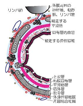 肉眼所見の理解に必要となる。上皮層は多列線毛円柱上皮であり、粘膜固有層には縦走する弾性線維がほぼ均等に密に分布する。その間に気管腺、気管支静脈に流入する毛細血管網、リンパ球などの炎症細胞が存在する。その下は輪走する平滑筋層よりなる。気管支鏡で透見できるのは約0.5mm程度で固有層の深さに相当する。
