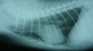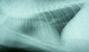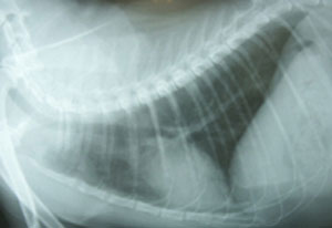 チンチラ、雄、7歳6カ月齢。室内飼育、混合ワクチン毎年接種。発作性発咳が1日1回程度20秒位続く。3年ほど前より生じ、次第に悪化し最近動きが少ない。