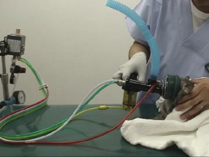 症例2は、発症に気づいてから3年も経過してから治療開始された。初期にステロイドの副作用も認められ管理には非常に苦渋した。ヒトではステロイド吸入療法前の罹病期間が1年を過ぎると喘息症状の改善効果は低く、逆に6ヶ月以内では著明な改善がみられたという臨床研究データが示されている2,4。気道リモデリングの進展度がその理由であろうと考えられている。本症例ではステロイド吸入療法が一時有効であった5が、結局は非協力的となり継続できなくなった。ある程度拘束を必要とするがIPVによる理学療法はdrug deliveryという点で確実であった。理学療法は器質的構造変化を改善させることはできないが、定期的な粘液除去によって気道開存し、長期間のQOLを維持できると期待される。実際、処置中何度か咳がみられるが処置後表情がよくなり、飼い主も効果を実感している。IPV療法は、肺を昇圧せずに高頻度の陽圧換気により肺内を直接パーカッションし、排痰促進させる新しい呼吸理学療法である。通常の酸素マスクを介し実施可能である。毎分60〜400サイクルの高速かつ高流量のジェット噴流と噴流毎の大気開放機構によって、末梢気道内分泌物に対するエアーハンマー効果による気道開通と気道内反転流による排痰効果が非常に迅速に発現する。さらに、手のひらほどの呼吸ヘッドと呼ばれる装置内にはネブライザーも組み込まれ、気道内乾燥防止と効果的なエアロゾール療法も同時に実施できる。ヒトでは、慢性閉塞性肺疾患の在宅治療を中心に呼吸療法として導入され、未熟児から成人・高齢者まで幅広く臨床実績をあげている。