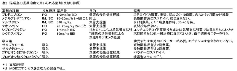 猫気管支喘息では気道リモデリングなどまだ解明されていない点が多いので、臨床経験を多く提示し、治療法の検討や今後の研究に生かすことが重要であると思われる。ヒトとは異なる機序で非可逆性気道閉塞に進展しているかもしれない。症例1-3の主な所見と治療概要を表1にまとめた。一般的な猫喘息の長期治療薬について表2に示した。なお吸入治療の臨床的効果についてはまだ明確な根拠はない。