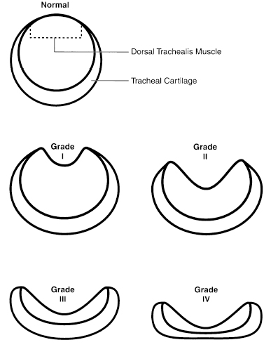 図46-1。気管気管支鏡検査所見を用いた気管虚脱の分類法。(Tangner CH, Hobson HP. A retrospective study of 20 surgically managed cases of collapsed trachea, Vet Surg 11:146149, 1982.からの許可の元で複製)