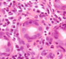 | 経過:T:38.3℃、P:148/分、R:40/分。室内外自由。ワクチンは幼少時のみで以降10年間接種なし。同居動物なし。食欲あり。右前額部に15mm×12mmの柔らかい結節あり肥満細胞腫と診断済み。中等度の脱水(BUN 53.1mg/dl)と高Na血症(166 meq/L)あり慢性嘔吐の影響と考えられた。FeLV(-)、FIV(-)。触診にて圧痛、マスなし。上腹部X線でも特異所見なく、精査のため上部消化器内視鏡検査を行なった。胃内に異物、粘膜異常、隆起病変なかったが、十二指腸粘膜に滑沢消失・粗造感が認められた。十二指腸粘膜の内視鏡下生検にて、粘膜固有層に形質細胞を主体とした顕著な炎症細胞浸潤が認められ、リンパ球プラズマ細胞性腸炎と病理診断された。食事内容に注意し、食後嘔吐みられたものを除外していった。市販ドライフードは嘔吐がみられるので中止した。その結果、タラと豚肉なら嘔吐がないことが判明した。 | |||