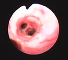 | 胸部X線。びまん性間質影がみられた。特発性心筋症の疑いもあり。 | 気管支鏡検査。粘膜は粥状の凹凸不整を示した | 気管支肺胞洗浄液中に悪性腫瘍性を疑う細胞塊あり | 肺病理組織。変性脱落した肺胞上皮細胞と硝子膜 |