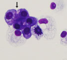 | 経過:受診時、浅速呼吸(88/分)を呈する呼吸困難でほぼ横臥状態。胸部レントゲンはびまん性間質影を示した。12時間の酸素療法後、急性感染症/アレルギー/腫瘍性疾患の鑑別のため気管支鏡検査を施行。粘膜は全体的に粥状に凹凸不整を示した。気管支肺胞洗浄液(RB3, 回収率75%)には活性化マクロファージが91.5%を占め慢性炎症パターンを示し、一方好酸球やリンパ球はわずかでありアレルギーや免疫介在性疾患は否定された。細菌や真菌も検出されなかった。また、マクロファージにまみれ悪性腫瘍性を疑う細胞塊がみられた。悪性腫瘍性疾患の可能性あり呼吸困難も改善されなかったので極めて予後不良と判断し、飼い主様と話合い安楽死を選択した。肺と心について病理検索を行った。肺は左右のほぼ全域にわたり強い急性間質性肺炎を示した。線維化も散見されたが、肺胞上皮の変性脱落、好中球・活性化マクロファージ・形質細胞の浸潤、毛細血管の鬱血、間質の浮腫、および硝子膜形成などの滲出期DAD所見が主体であった。腫瘍細胞浸潤は認められなかった。心筋には特発性心筋症を示す病理所見はみられかった。BALの細胞診で異型細胞と思われたものは変性脱落した肺胞上皮細胞であったと考えられた。慢性の炎症性病変に何らかの刺激による強い急性炎が加わって形成された病変と考えられた。 | |||