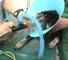 | 経過:初診時、身体検査にて体温38.2℃。明らかなチアノーゼを呈し呼吸促迫。チアノーゼ、CBCおよび生化学検査にて白血球数 40900/μl(Sta818, Seg35583, Eos1023)と上昇、胸部X線にてびまん性肺胞浸潤影を示すが心陰影に形状異常なし(VHS=10.8, CTR=0.48)、心エコーにて左房拡張・MRを認めず、血液ガス分析にてpHa 7.50, Paco2 23 mmHg, Pao2 44 mmHg, [HCO3-] 18 mmol/L, A-aDo2 78 mmHg, P/F=210で、重度な低酸素血症を伴った慢性呼吸性アルカローシスを示した。そこで、非心原性肺水腫 またはAcute Lung Injuryと臨床診断した。酸素室管理とし、まずフロセミド2mg/kg IM q1hを2回、次にメチルプレドニゾロン125mgIVを1回投与したが、ともに反応せずびまん性肺胞浸潤影は次第に悪化した。治療開始8時間を経過してもPao2 46 mmHgにて改善みられず、スパンカー(パーカッションネア・ジャパン株式会社、東京)を用いたIPV療法を試みた。呼吸ヘッドに酸素マスクを取り付け、操作圧25psi、パーカッションレベルはHardに設定した。治療者は呼吸ヘッドを右手で保持しマスクを口吻部に密着するように当てながら、肺内パーカッションを始めた。後肢の趾間にSpo2のプローブを設置し連続的に経皮的酸素飽和度を観察した。治療直前にはSpo2は69%を示したが、1〜2分で92%にまでただちに上昇した。一回に15〜60秒程度パーカッションを継続した。初日に30分間を30分おきに7回、2日目に20分2回行った。はじめの4回を終了した時点で(IPV開始4h)でPao2は64mmHgに上昇し呼吸状態は改善した。2日目の朝にPao2 77 mmHg、3日目は IPV実施せずともPao2 94 mmHgと正常化し、びまん性肺胞浸潤影もほぼ消失し全身状態も改善し退院となった。 | |||