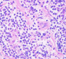 | 初診時頸胸部X線所見。頚部気管狭小化が認められた。 | 気管支鏡所見。喉頭直下の狭窄。全周性粘膜肥厚、凹凸不整あり。 | 粘膜肥厚部の病理組織所見。間質に軽度の線維化を伴ったリンパ球主体の炎症細胞浸潤あり。 | Tチューブ設置後頸胸部X線所見。気管開存し、努力呼吸が消失した。 |