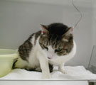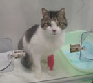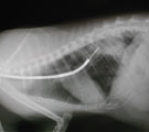 | 雑種猫、オス、21歳。体重3.55kg。慢性間質性肺炎の治療を3年間続けてきたが2ヶ月前より新たに左肺後葉背側部に浸潤影が現れ次第に呼吸状態が悪化してきたので気管支鏡検査を行うことになった。 | |||