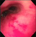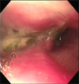 | 経過:初診時、パンティングと鼻詰まり症状あり。多量の漿液性鼻汁もみられた。動脈血酸素分圧は89.9mm Hgで正常。翌日全身麻酔にて内視鏡にて口腔から咽頭鼻部および後鼻孔を観察した。粘膜は重度発赤・浮腫を呈し、左右の後鼻孔をまたがるようにしてある異物を確認した。把持鉗子にて容易に除去できた。異物はイネ科の雑草の一部で長さは3.6cmだった。 | |||