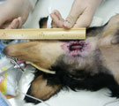 | 経過:心拍数138/分、呼吸数36/分。安静時以外は喘鳴のため呼吸困難。呼気努力あり。喉頭にて高音調の喘鳴音は最強、咽頭側でわずかに減弱、頚部気管側に移行すると喘鳴音は減少。肺音にクラックルなし。頚部-胸部X線写真所見:肺野には軽度のびまん性間質陰影あり。他異常所見なし。CBCおよび血液生化学検査: PCV61.4%と多血傾向。血液ガス分析所見(room air): pHa 7.40, Paco2 50 mmHg, Pao2 58 mmHg, [HCO3-] 30.4 mmol/L, BE 5.0mmol/L, A-aDo2 34mmHg。低酸素血症を伴った代償された慢性呼吸性アシドーシス。慢性上気道閉塞による肺胞低換気と考えられた。ビデオ透視検査所見:吸気時、喉頭が尾側に大きく移動し、口咽頭にガスの異常貯留あり。頚部超音波検査所見:吸気時の両側ヒレツ軟骨外転不全あり。カプノグラム(径マスク通常呼吸下):閉塞性パターンがみられた。鼻腔鏡検査:鼻咽頭に閉塞病変なし。緊急処置:喉頭麻痺と暫定診断し気切チューブを設置。ただちに呼吸状態は安定化した。第4病日、内視鏡にて両側性喉頭麻痺を確認し、特発性喉頭麻痺と診断した。そのまま、Tチューブ設置(開放管理)を行った。しかしチューブ内に乾燥した分泌物が付着し管理困難となったため、第19病日、左側Tie-back術+Tチューブ設置(閉鎖管理)を行った。それでも興奮時喘鳴症状がみられたので、第80病日、永久気管ろう造設術をおこなった。気管外周の約1/3、長さ4リングを切除し、幅1.5cm×長さ3cmの気管ろうを造設した。術後管理はネブライゼーションとろう孔洗浄のみできわめて経過良好であった。Paco2 36mmHg, Pao2 91mmHgと血液ガスは正常化し、第96病日退院となった。自宅では、ネブライゼーション1日2回、ろう孔洗浄1日3-4回、室内湿度維持、乾燥冷気時外出および全身浴の禁止を指示し、現在、術後6ヶ月間経過良好である。 | |||
