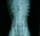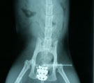 | 経過:受診時、レントゲンにて骨盤の恥骨前縁に骨の変形あり骨盤腔側に突出していた。そのため排便障害が生じ結腸内に巨大な宿便がみられた。恥骨前縁の変形は交通事故の影響によるものと考えられた。恥骨部分の突出部を削ったとしても再び術後増殖して再び骨盤腔が狭窄する可能性が高いので、矢田式骨盤拡幅プレート設置を行った。術直後の腹部レントゲンにて秘結便が十分通過できる程度、骨盤が拡幅されていることを確認した。術後経過は極めて良好で、毎日排便がみられるようになった。術後2-3日は軽度開脚して歩行していたが次第に正常歩様になり、1ヶ月後には歩行に何も問題がみられなくなった。 | |||