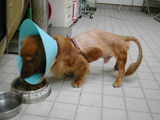 | 初診時。後肢の対麻痺。ほとんど随意運動なし。 | 脊髄造影。T12-T13間の背側で充填欠損像あり。 | 手術所見。脱出した髄核の摘出前(上)と後(下)。 | 術後2週間で自分で立ちながら食事を食べられるようになった。 |