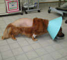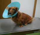 | コメント:この例はダックスフンドでよくみられる椎間円板ヘルニアではありませんでした。脊髄造影で好発部位よりかなり後ろに異常があったので髄内腫瘍で手術も効果ないかもしれないとも思っていました。でも大学でのMRI撮影を待っては1-2ヶ月先になってしまいそれまでに状態悪化する可能性もあり手術を行いました。結果はよかったですがちょっと冷や汗ものでした。 | |||