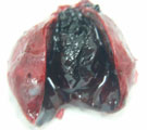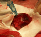 | コメント:胆嚢粘液嚢腫は緊急外科手術適応です。放置すると胆嚢が破裂し腹膜炎を起こし、診断も治療も非常に困難になり予後不良となってしまいます。この症例の胆嚢壁も慢性炎症のためもろくなっていました。逆に手術で胆管のうっ滞を改善し、胆嚢を摘出すれば、閉塞性肝障害が解除され全身状態が改善されます。またこの疾患は副腎皮質機能亢進症に合併することが多いようです。高コレステロール血症が原因のひとつとも考えられるので、今後もop'-DDD治療等の継続が不可欠になってきます。 | |||