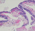 | 腹部エコー所見。胆嚢壁の肥厚(7.2mm)と中央の不動性胆泥。胆嚢粘液嚢腫と臨床診断した。 | 術中所見。胆嚢は暗赤色で固く拡大していた。直接生食を注入し総胆管を開通させた。 | 切除胆嚢所見。胆嚢壁は黒色粘液状物で裏打ちされ、内部に黒色の胆泥が凝縮されていた。 | 胆嚢の病理組織所見(強拡大)。胆嚢上皮は大部分が壊死・脱落していた。 |