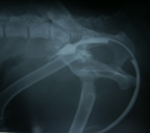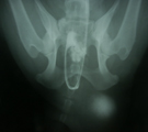 | 経過:初診時、直腸温計測できず、心拍数:68/分 呼吸数:28/分。左会陰部が波動感ある著しい腫大を呈していた。試験穿刺を行ったところ尿が360ml採取された。鎮静下にて、尿道カテーテルを介した逆行性尿路造影で前立腺直前に強い抵抗あり尿道内に造影剤が逆流してきた。DV像にてわずかに骨盤外の膀胱に造影剤が貯留しており、lateral像では前立腺管に造影剤が流入し肥大した前立腺が造影された。前立腺直前の尿道が後方に屈曲しヘルニア嚢内に膀胱が嵌頓していることが分かった。排便障害は、前立腺肥大にも原因があると思われた。血液生化学検査でいまだ尿毒症に至っていないことを確認した。ただちに、外科的に左側会陰ヘルニアの整復術、膀胱や結腸嵌頓防止のための腹腔内結腸膀胱固定術、前立腺肥大治療のための去勢術を行った。まず、会陰部切皮前に再度経皮的穿刺し採尿したあと膀胱をヘルニア孔の腹腔側に向け指でできる限り押し入れながら導尿カテーテルを進め、膀胱を環納した。ヘルニア整復は、内閉鎖筋腱を切断し弁状に反転したもの、外肛門括約筋、尾骨筋のそれぞれをマットレス縫合であわせ閉鎖した。結腸膀胱固定術は開腹下にまず下行結腸を左腹壁に3-0Dexonにて4糸の結節縫合にて固定し、その後膀胱の体部を結腸に2糸縫合し反転しないようにした。閉腹後、去勢手術を行った。術後翌日より食欲あり一般状態は改善した。術後8日で痛みなく排便可能となった。飼い主によると、この犬はとても神経質でケージに入ると鳴きわめき、人に咬みつく事があるかもしれないということだったが、手術による整復後、性格は温厚になり、忠実に言うことをきくようになった。術後10日で抜糸完了し退院となった。退院3週間後オーナーより連絡があった。快食快便となり、以前は好物をやっと食べるだけであったが今は何でもすぐに食べ、性格が明るくなった。以前は物陰に隠れたり、人目を盗んで脱走したりするような陰気な性格であったが、退院後そのようなことが全くなくなったという。 | |||
