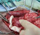 | 初診時逆行性尿路造影DV像。骨盤外の膀胱に造影剤が貯留していた。 | 同lateral像。前立腺直前より造影剤が逆流し、前立腺が造影された。 | 術中所見。会陰ヘルニア整復術。鉗子の先は反転した内閉鎖筋弁。 | 同。結腸膀胱固定術。下行結腸を左腹壁に固定。膀胱は指で保持。 |